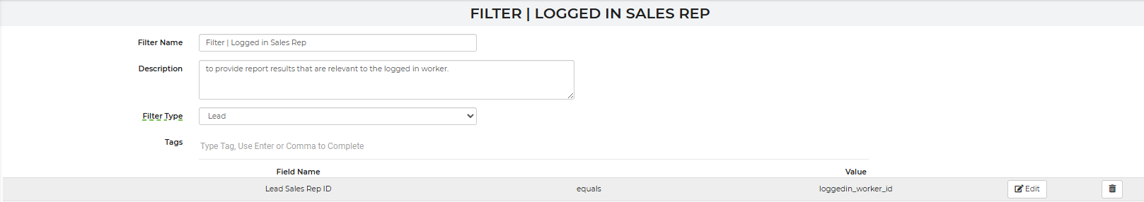 When a sales rep views the report from their worker account, the system will compare their name against leads' sales rep field to only show their results.