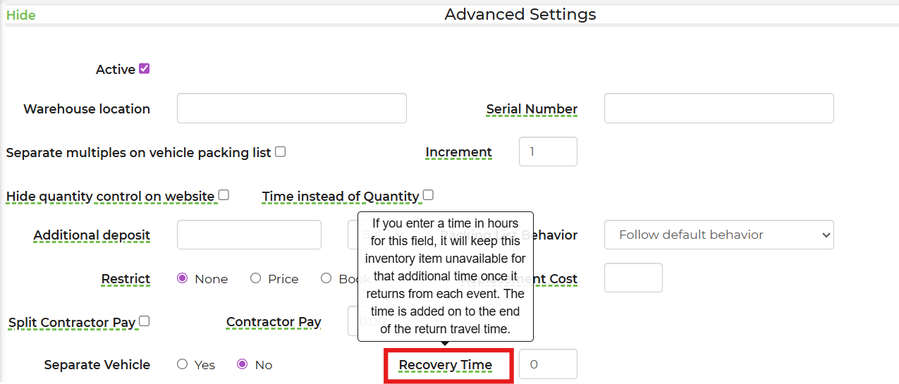 Correct! In these settings, the importance of having a Recovery time is prevent back to back bookings. This can help with the rental items that need extra time for cleaning before renting the item(s) again. These are in HOUR increments.
