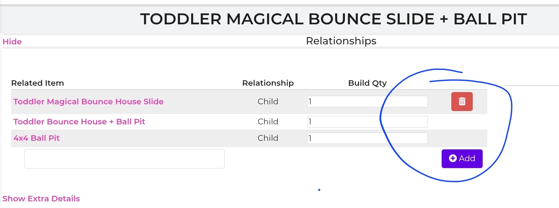 I need help setting up inventory relationships correctly for our ball pit and toddler bounce house combos.