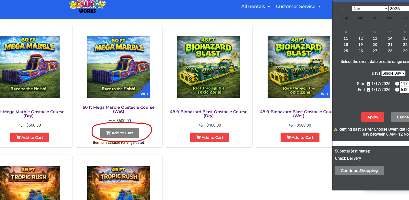 I noticed my 60ft obstacle course wet option keeps saying not available even after I changed the date a few different times to make sure. I went through maintenance, I checked blackout dates. I cannot figure out why its showing as not availed. please help! its link to our dry version as well if that helps. also rent them separate 30ft and a 14ft slide.