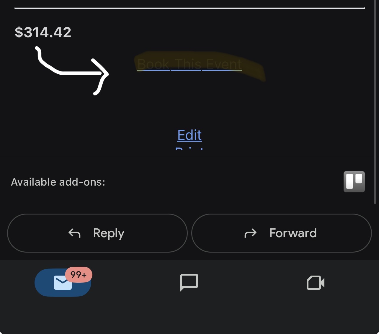 Hey team, I am reaching out today because some clients have had difficulty booking events online with us after we send them a quote. The "Book This Event" hyperlink at the bottom of the page, as included in the picture submitted, is in a font that is hard to see and blends into the background of the email. Even when I describe to customers where to look, I either lose the booking because it's too complicated, or they just can't see it. I am requesting that the hyperlink be changed to something bold and noticeable so we will stop losing business. Thank you and looking forward to your prompt response!