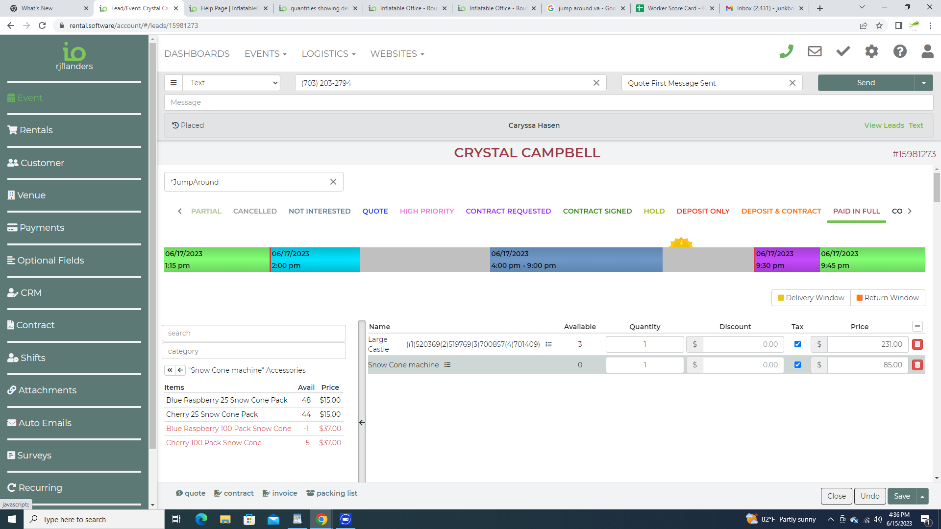We need to make a doc for this, but this it how it works. The amount shown 'on hand' is as of the current time. Scroll down to the quantity section and each date will show the amount deducted due to lead(s) you have scheduled on that date. We do not deduct for quotes, only scheduled events. We only show dates where it's being used. You can add quantities there as well when you buy more stock.