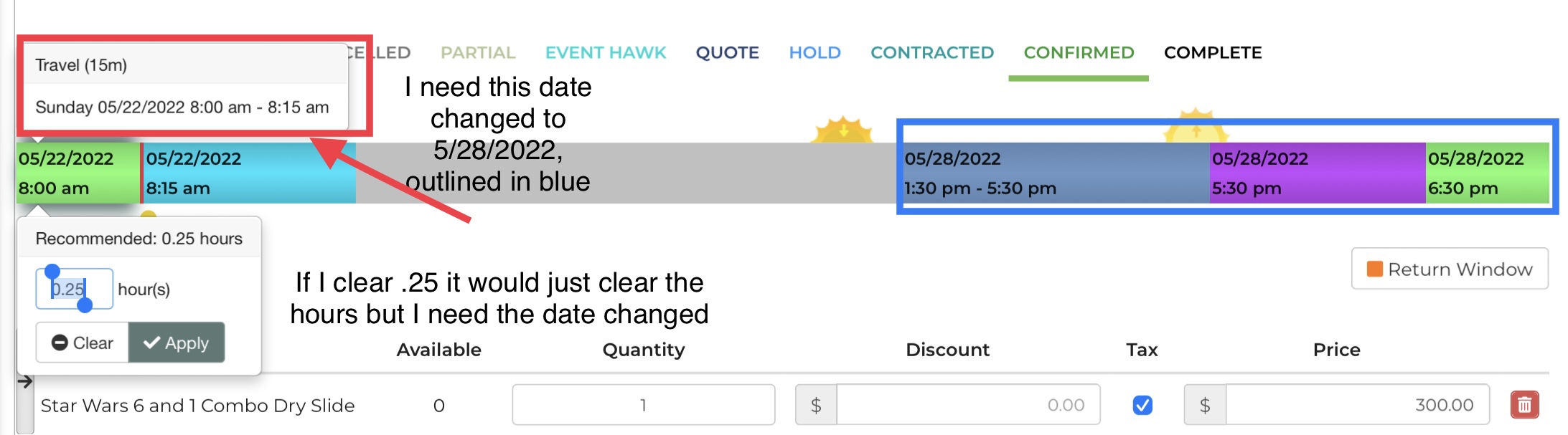 My customer want to change there event date. I’ve been able to change the event date however the delivery and setup date is still set to the old event date. This is causing a problem because when I look at the calendar the customer information is displaying on all the days from the old event date to the new event date. How do I fix this?
