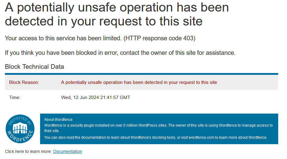 My website isn't working because wordpress says a potentially unsafe operation ha been detected in the request to the site. I can't access the admin console to try to fix. I have tried to log in from different devices, locations, and have tried to log in using a vpn but it says the same thing.