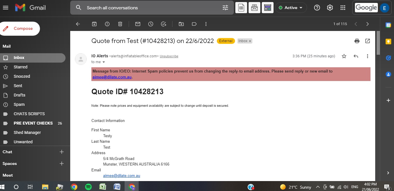 Since we connected IO to our website we have our quotes coming in IO directly and an email sent through to our enquiries@monsterball.com.au email (just to make sure we don't miss out any enquiries since it is a new system we have in place to have IO connected to our website)