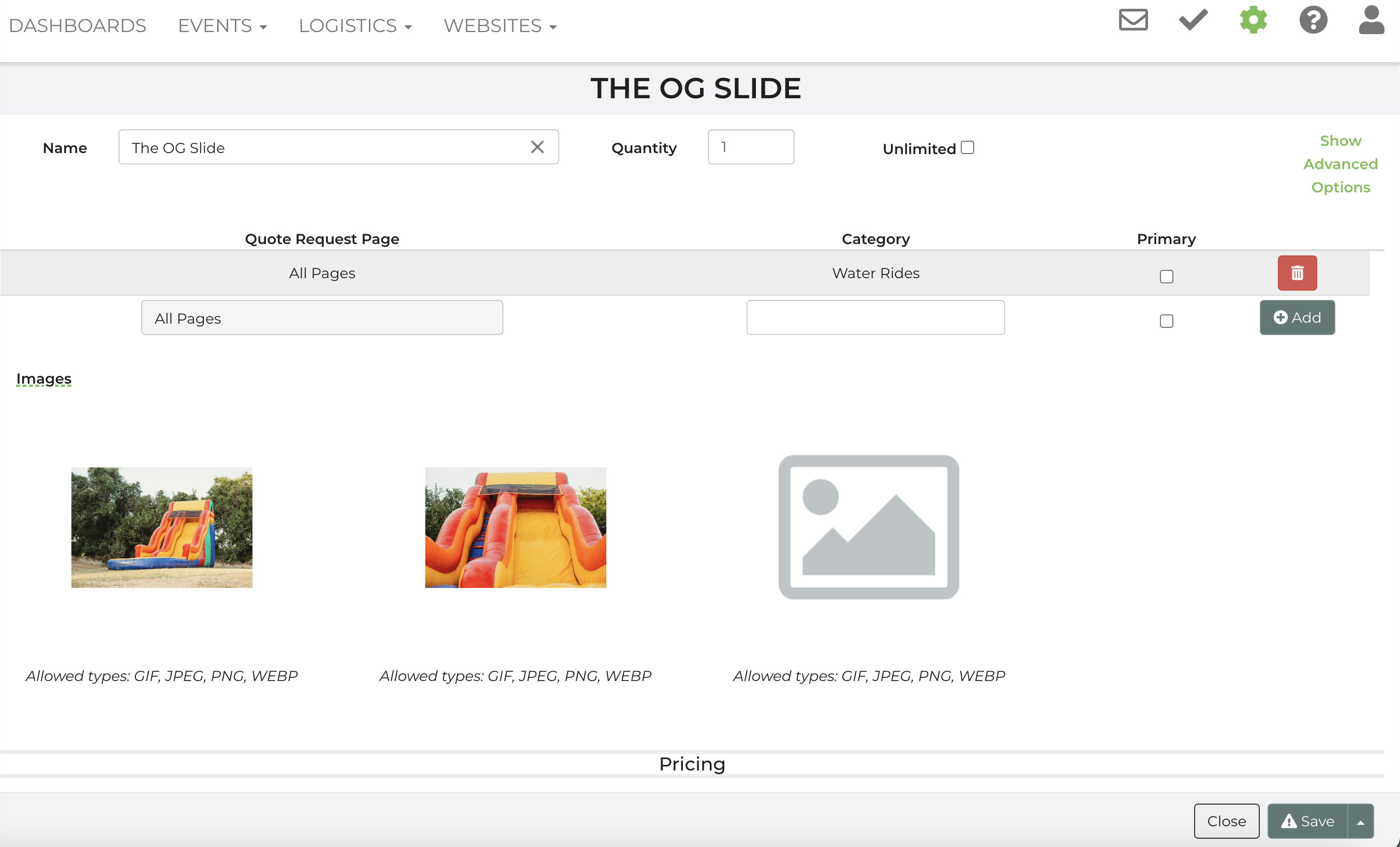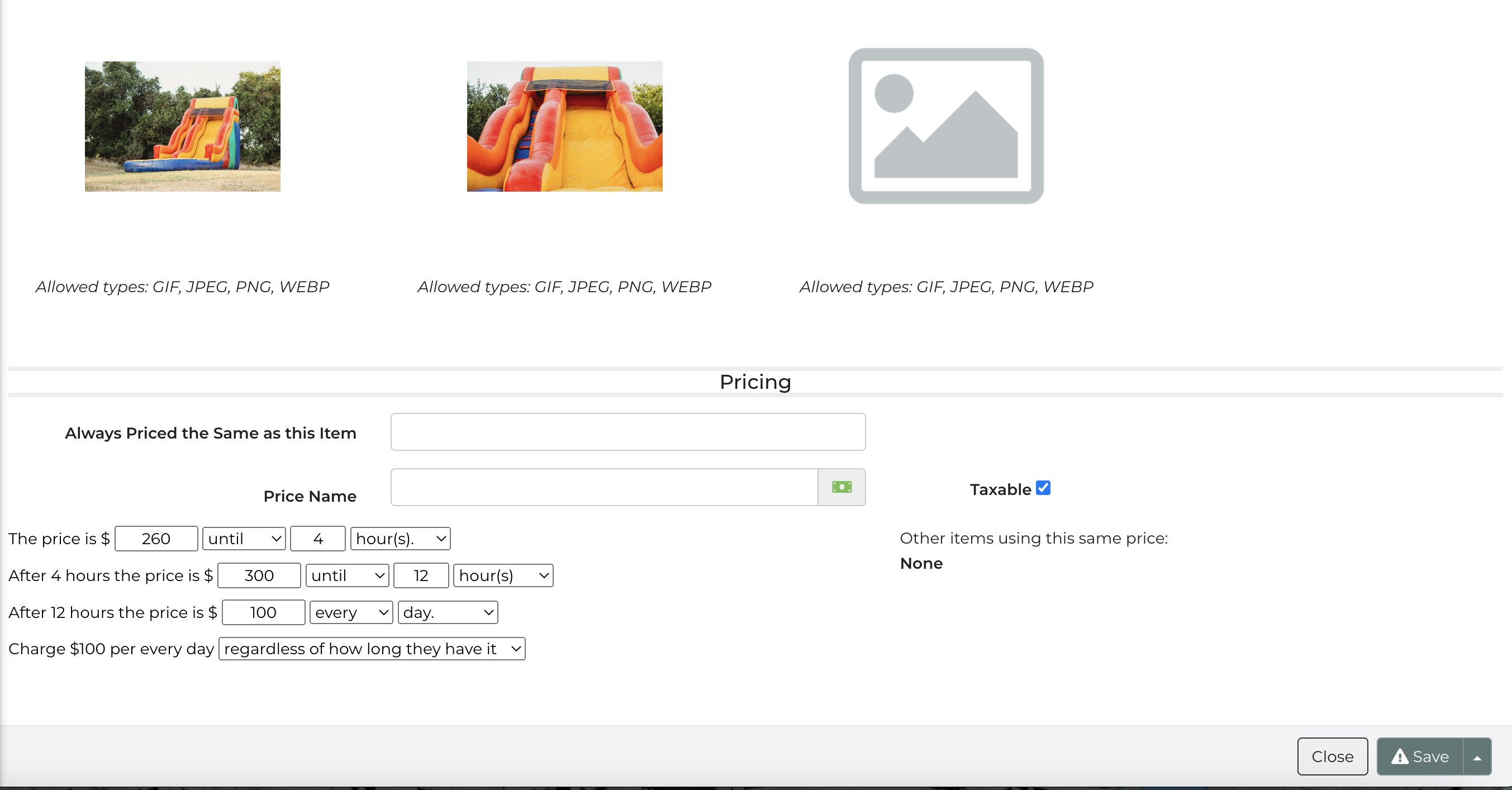 Trying to save a new rental item under inventory. When clicking save, I get an exclamation point, and then am not able to do anything else. It's not saving to my inventory.