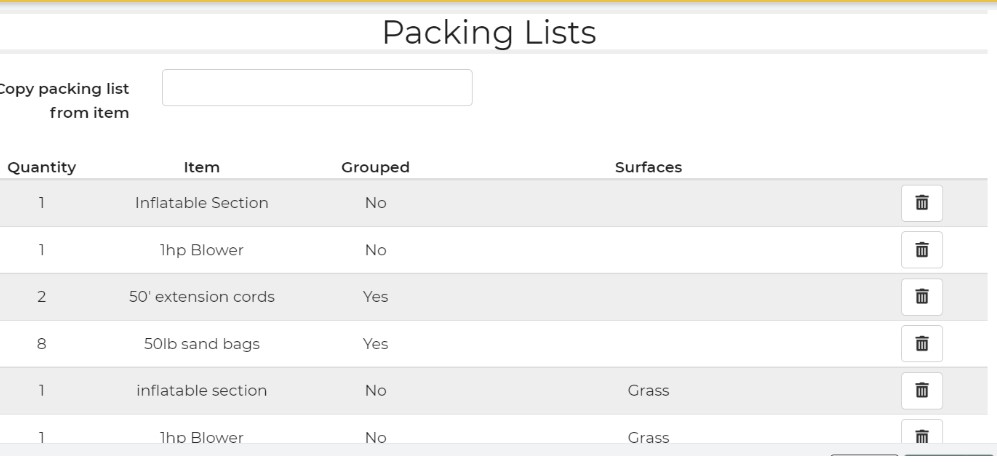 You can create a list of packing list items that go with each rental item. For example, you may want to specify the number of sandbags or stakes to bring with a Bounce House. When editing an item, click the Packing List in order to set the packing list for that item. You can even specify a different packing list depending on the surface type, that way you can bring stakes if the event is on grass and sandbags if not. This article reviews packing list.