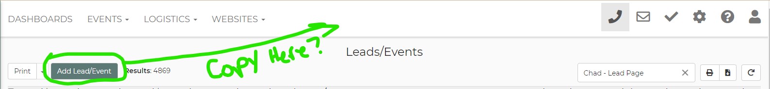 Could you add the "Add Lead/Event" button to the IO header between "website and the icons? That way we can navigate to it quickly from anywhere. Pic attached for idea.