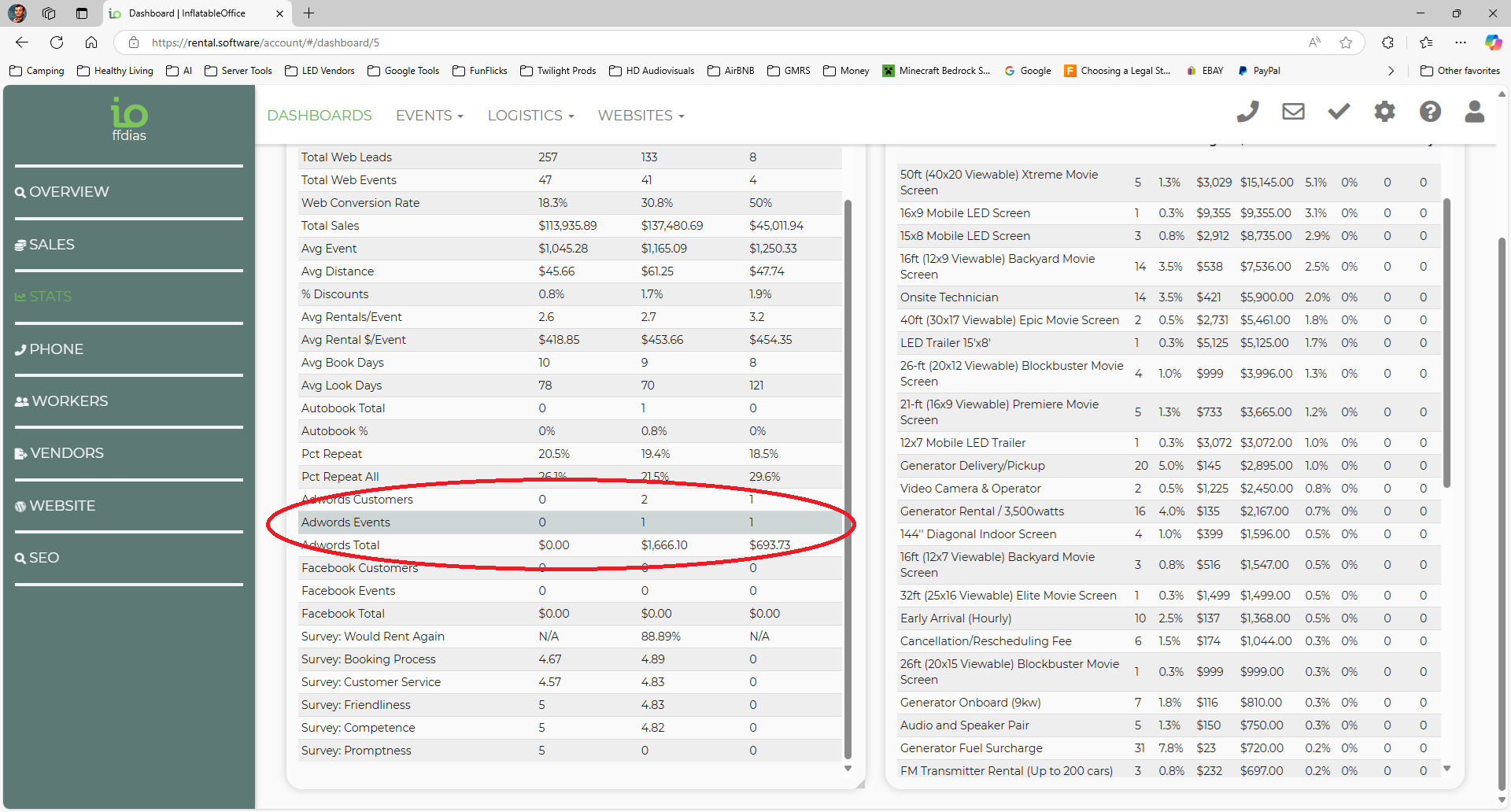 Could you help me identify where the attached dashboard statistic is showing we have 1 lead from Adwords? What source triggers this statistic? and how is the total 693.73 generated?