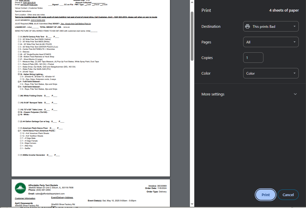 We have added colored font to our packing lists for important notes, when we go to print just the packing list in color, it will print in color. When we add on unsigned contracts to the total print outs, it reverts the packing list to black and white but the unsigned contract prints in color. I have attached a screenshot of what I am seeing from my end.