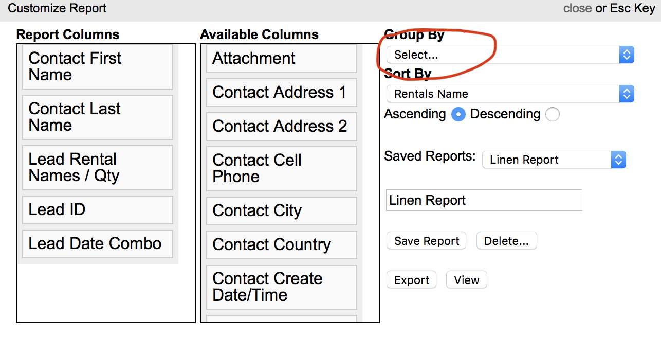 I attached a screen shot. I removed the top option where you had a variable enter in "Group By" . You can edit this reports by clicking on Customize Report on the bottom of the leads page. Once there click on the report in the drop down box that you want to edit. See if this works the way you need it to.
