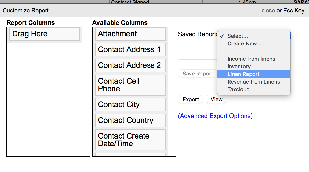 Under Customize Report, when I hit select the Linen Report does not show up at all. I can only see Create New ....