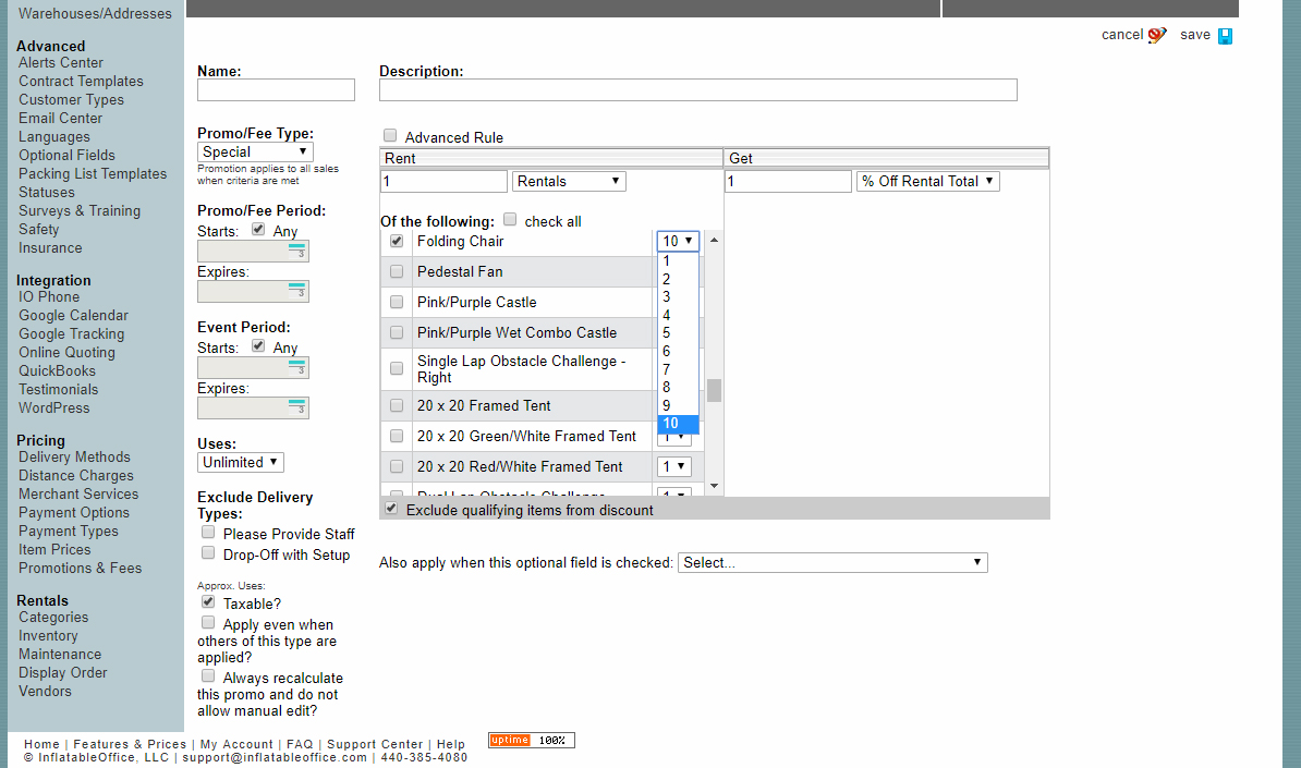 I'm trying to create a new promo where a customer can rent only 4 tables and 32 chairs and receive a discount but when selecting the chairs the drop down menu only goes up to 10. It's also doing it on the tables (although I only want to select 4 tables anyways). Please help, thank you.