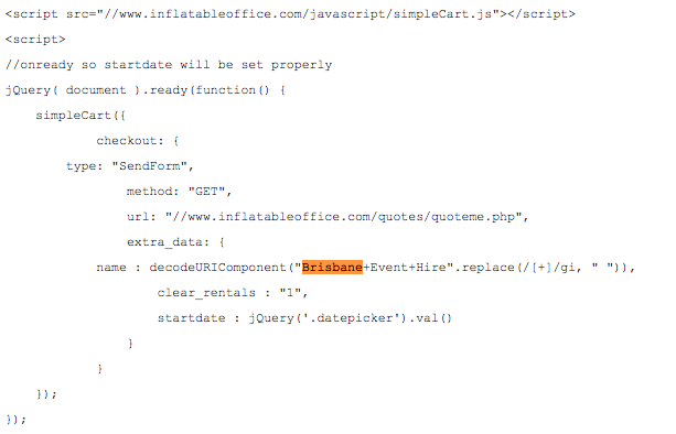 In the shortcoder for io_cart, we updated %%page%% to Brisbane+Event+Rental as per screenshot.