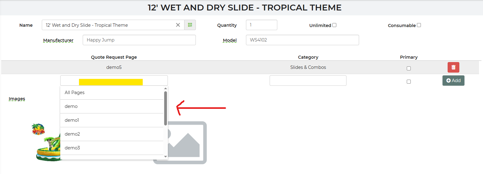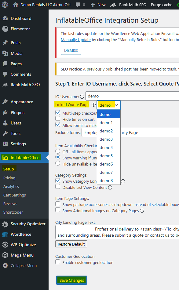 On the setup page, find the Linked Quote Page option and select the newly created page group.