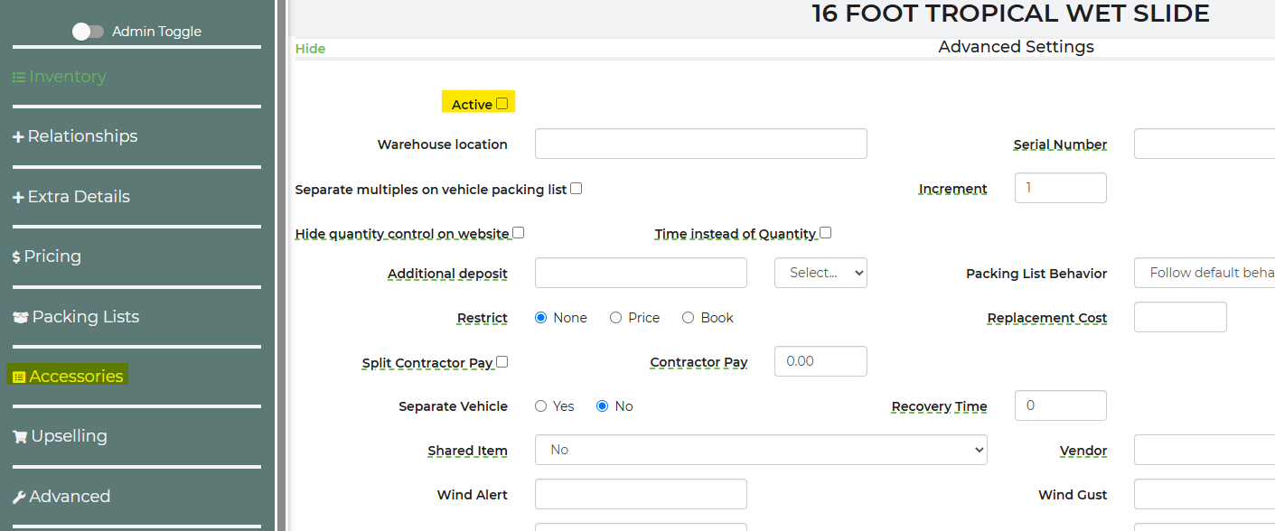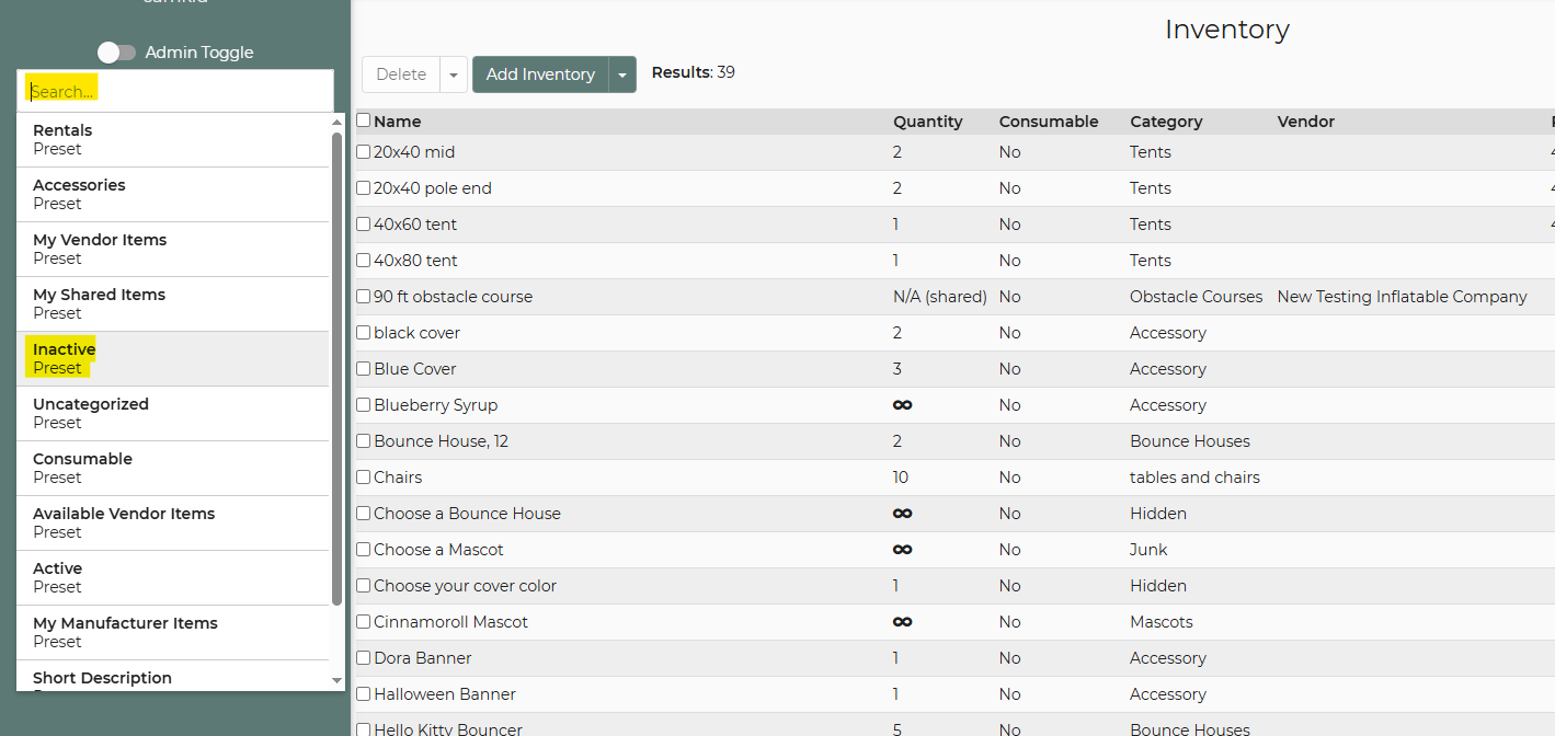 When a rental item is deleted, it is not permanently removed from the system. Instead, it is moved to the Inactive section. All associated information and settings for that item are retained, allowing you to easily restore it if deleted accidentally or if you choose to reactivate it later.