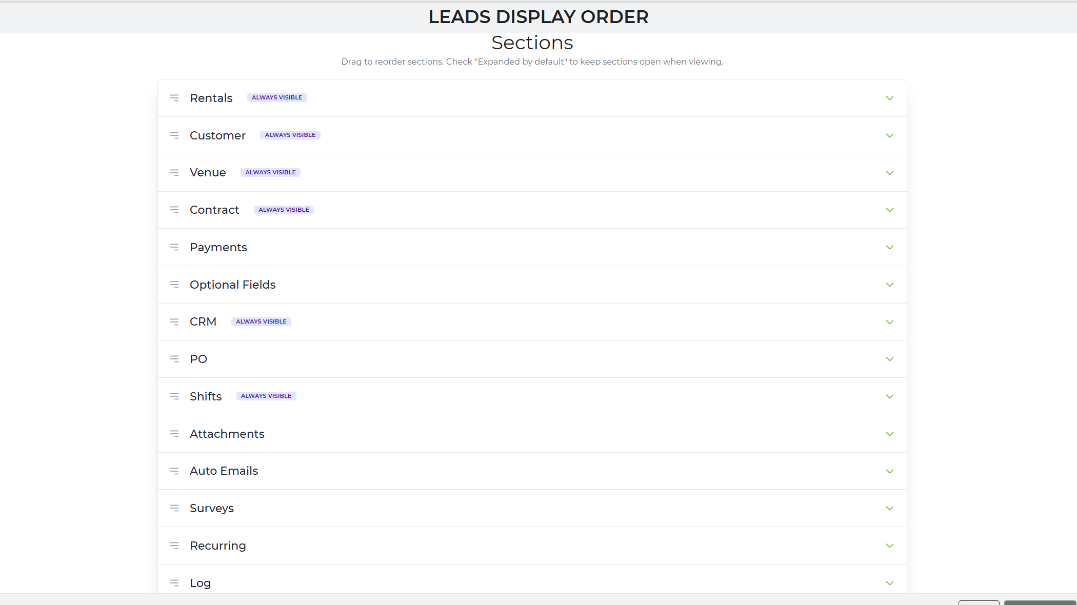 - Lead Sections: This will affect the order of the sections when viewing a lead. It is possible to be set per login. This is also where you can choose to expand certain fields, too.