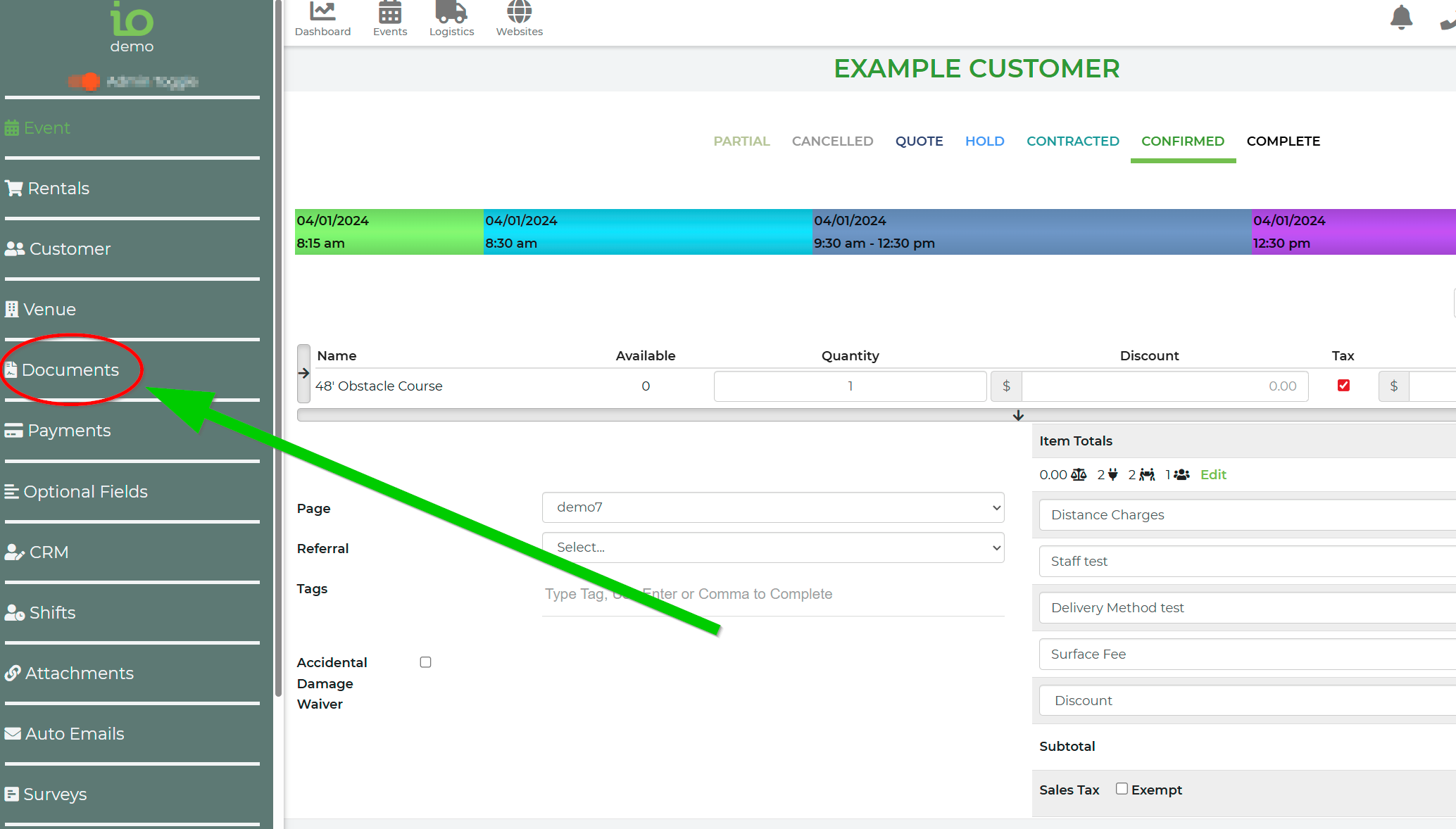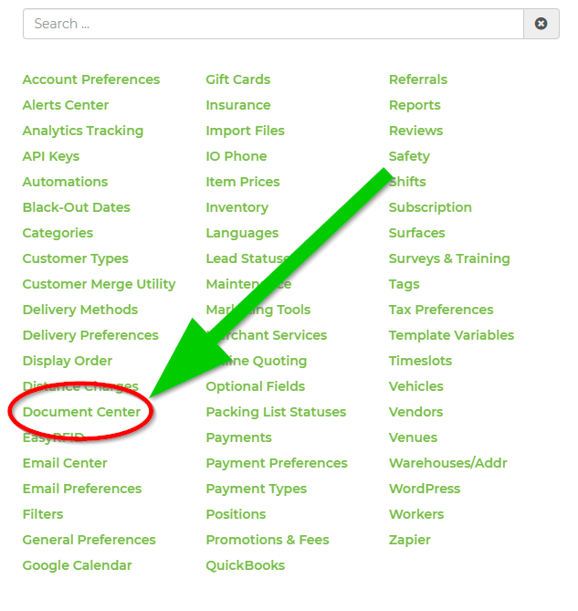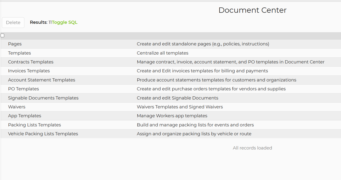 - Document Center (Settings>Document Center): Central hub for Contracts, Pages, Templates, Waiver Templates, Signed Waivers, and other related documents.