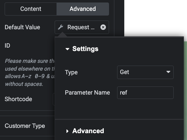 •    Under default value select "Request Parameter" and set Type to "Get" and Parameter Name to "referral" or "ref" depending on the link parameter you'd like to request to set your tag.