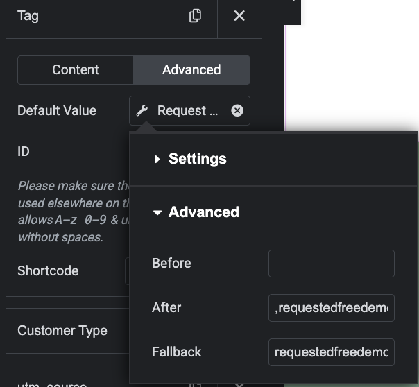 • While settings are still open, under advanced, enter the Before, After, and Fallback tags associated with your form submission.