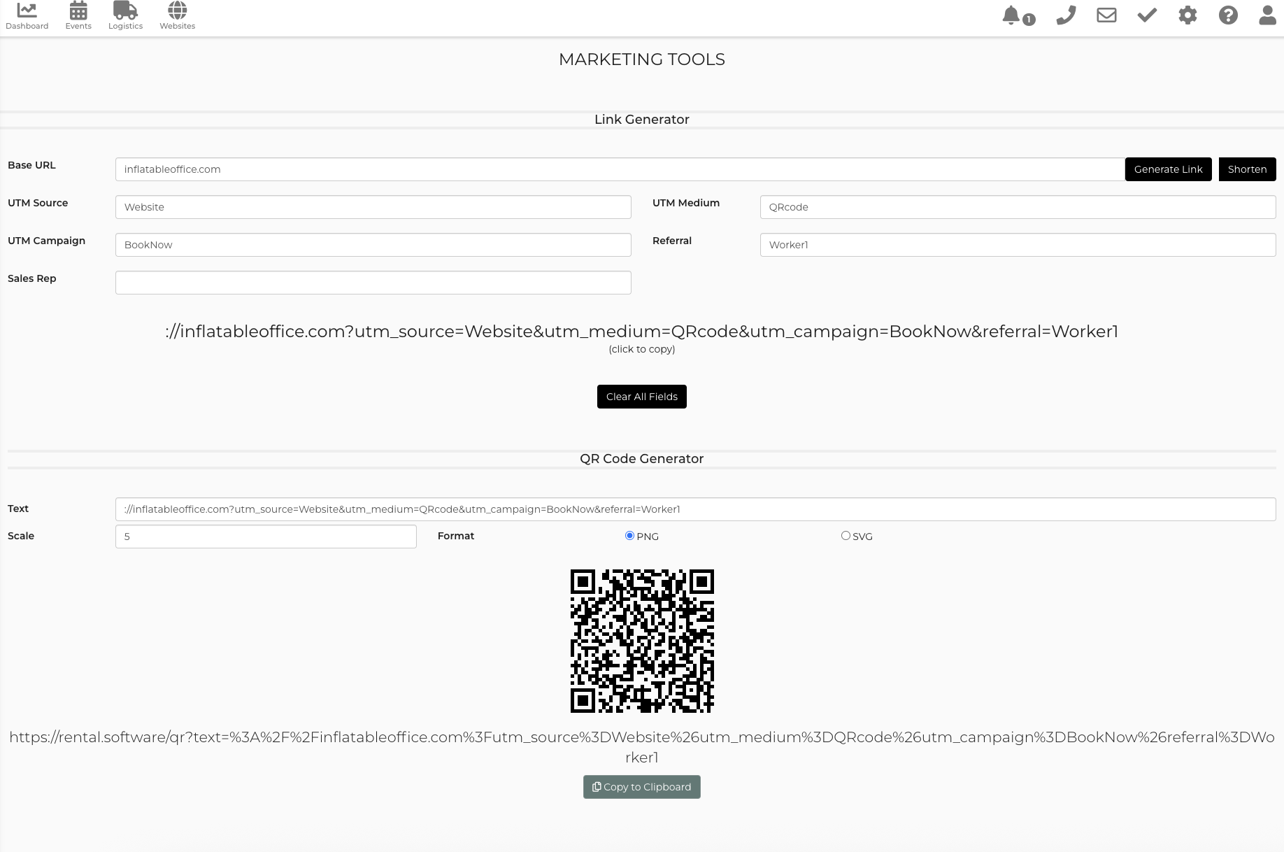 • There are easily accessible tools on the "Marketing Tools" page under the gear "Settings" dropdown within the software for creating links with UTM parameters, referral parameter, sales rep parameter, shortened links, and a QR code generator.