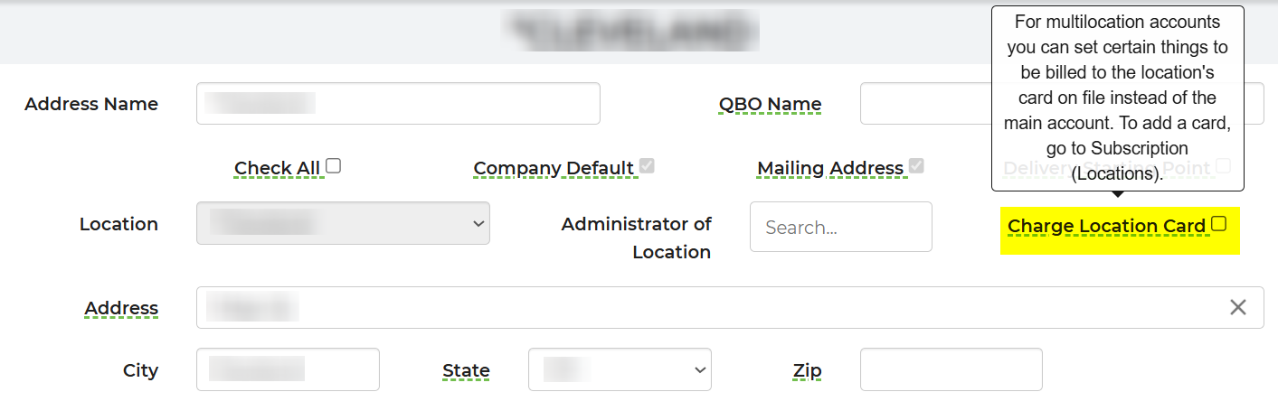 You can setup to manage subscription payments for different locations under separate payment methods. This will allow you to charge different parts of your subscriptions to location specific payment methods. See below for how to setup each individual portion. The main card on your account, will carry the entire subscription unless you change the following options. Each one of the charge specific adjustments below is optional depending on your preference.