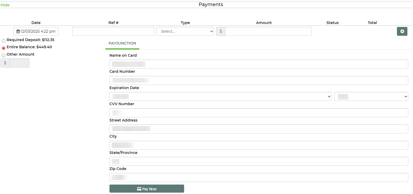 To record a payment, if you are not using a payment method that is integrated with IO, you must be in the lead/event in which you are taking the payment for. Once in the lead, navigate to the payments section and record the payment.