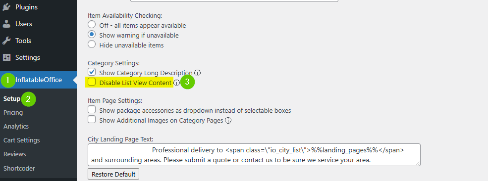 - Locate the List View option labeled "Disable List View Content" for category pages and toggle it on or off.