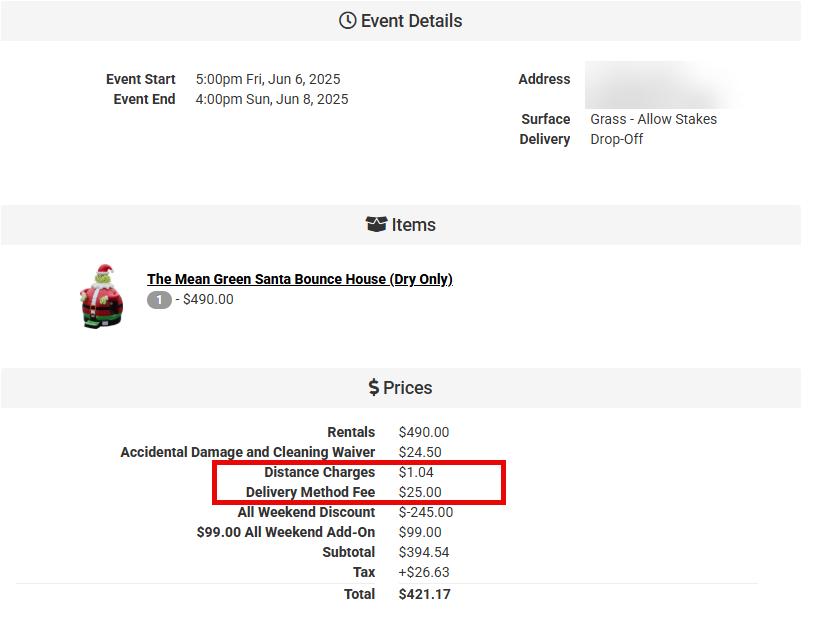 We want to have one line item called Travel and Delivery: $x.xx instead of the Distance Charges and then the Delivery Method Fee.