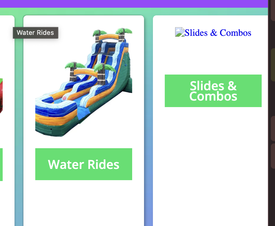 Hello! So today I noticed that when I went on my website while using my computer two images are not appearing. Its on the main page. I am missing water rides and slides/ combos. When I go on my phone I can see the images. How would I be able to fix this.