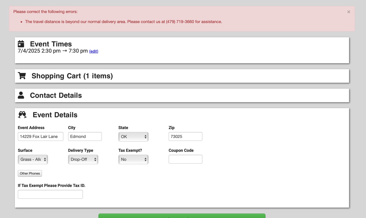 On the attachment, I tried to Crete an order for my house, the same as the warehouse address and I get an error that it is out of the delivery location. Not sure how I fix this. I have been looking answers for the last hour.