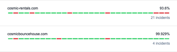 For cosmicbouncehouse.com, I'm not sure what the scale that monitor service is using, but 99.9% uptime seems very good. Internally if we notice a website is having issues, it may get moved to another server where it's been copied ahead of time to reduce downtime. This process can take up to a minute based on A records propagating. That may be what you're seeing there.