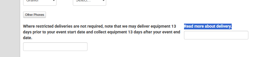 “Where restricted deliveries are not required, note that we may deliver equipment 13 days prior to your event start date and collect equipment 13 days after your event end date. – Read more about delivery.”Let me know if you need any further details from my end.