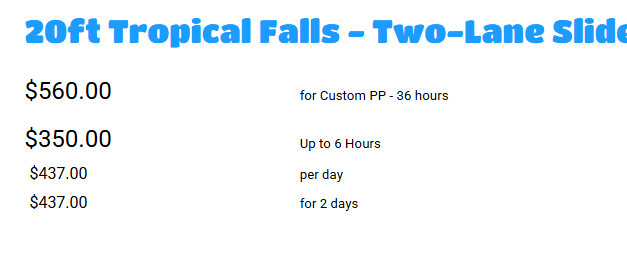 The 6, 8, and custom price point all calculated correctly, but the other two did not. The $437 is actually my overnight price for that unit. One day should have been $560 and the 2 day (48 hours) should have been $770.