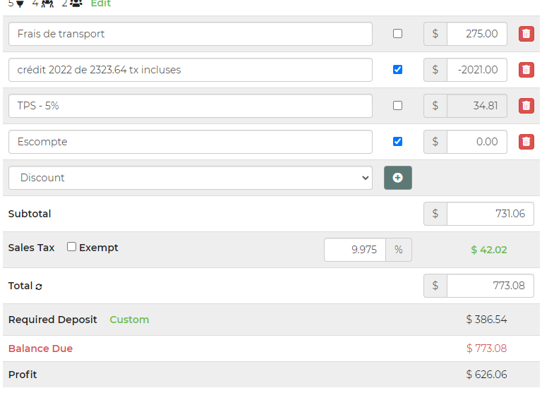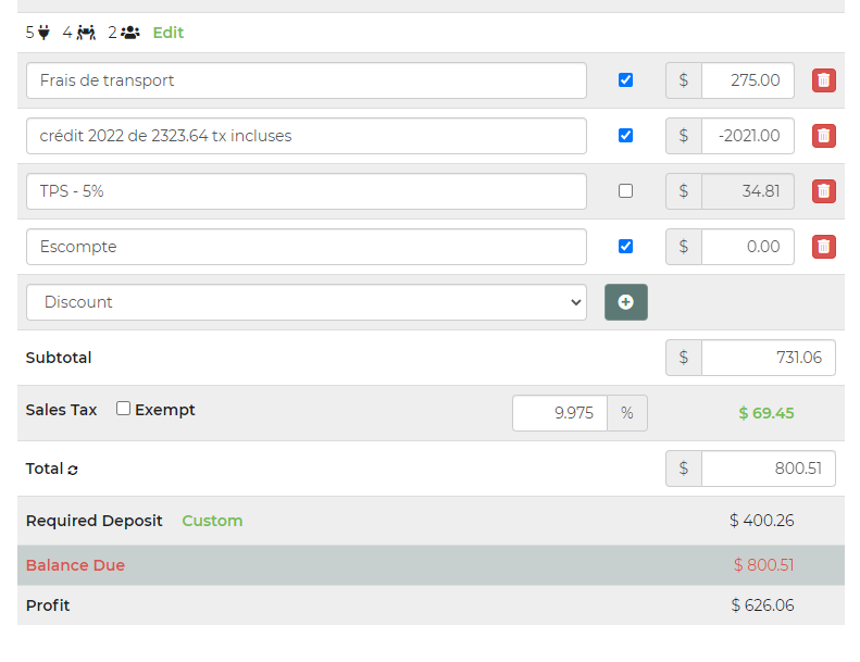 Use the checkboxes beside each line item to apply/remove taxes from each item on the lead. When they are not are not saved discounts or fees this has to be done manually...otherwise can be done under Promotions & Fees