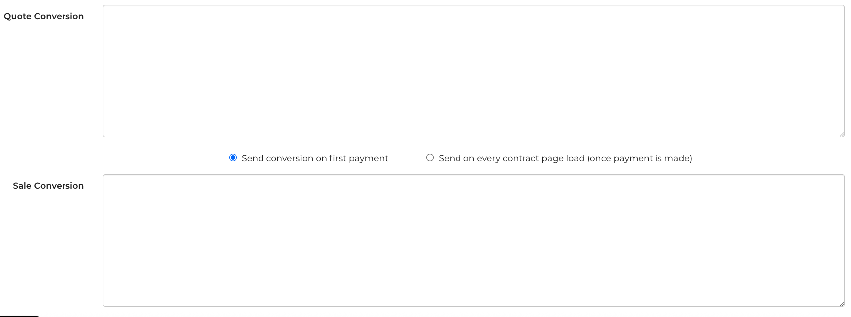 A quote conversion is triggered when the quote confirmation page loads. A sale conversion is triggered when loading a contract page, but only if payment is received.