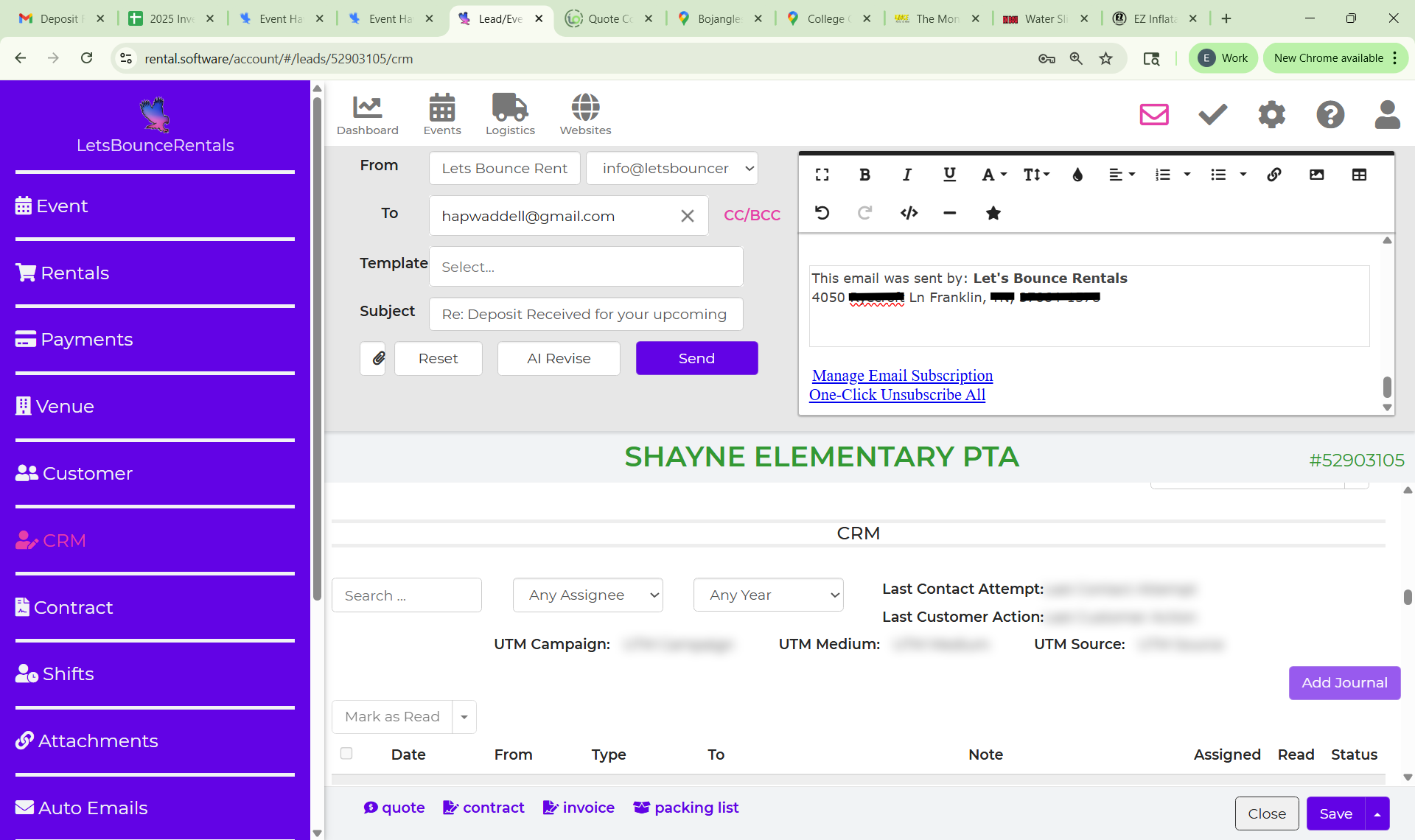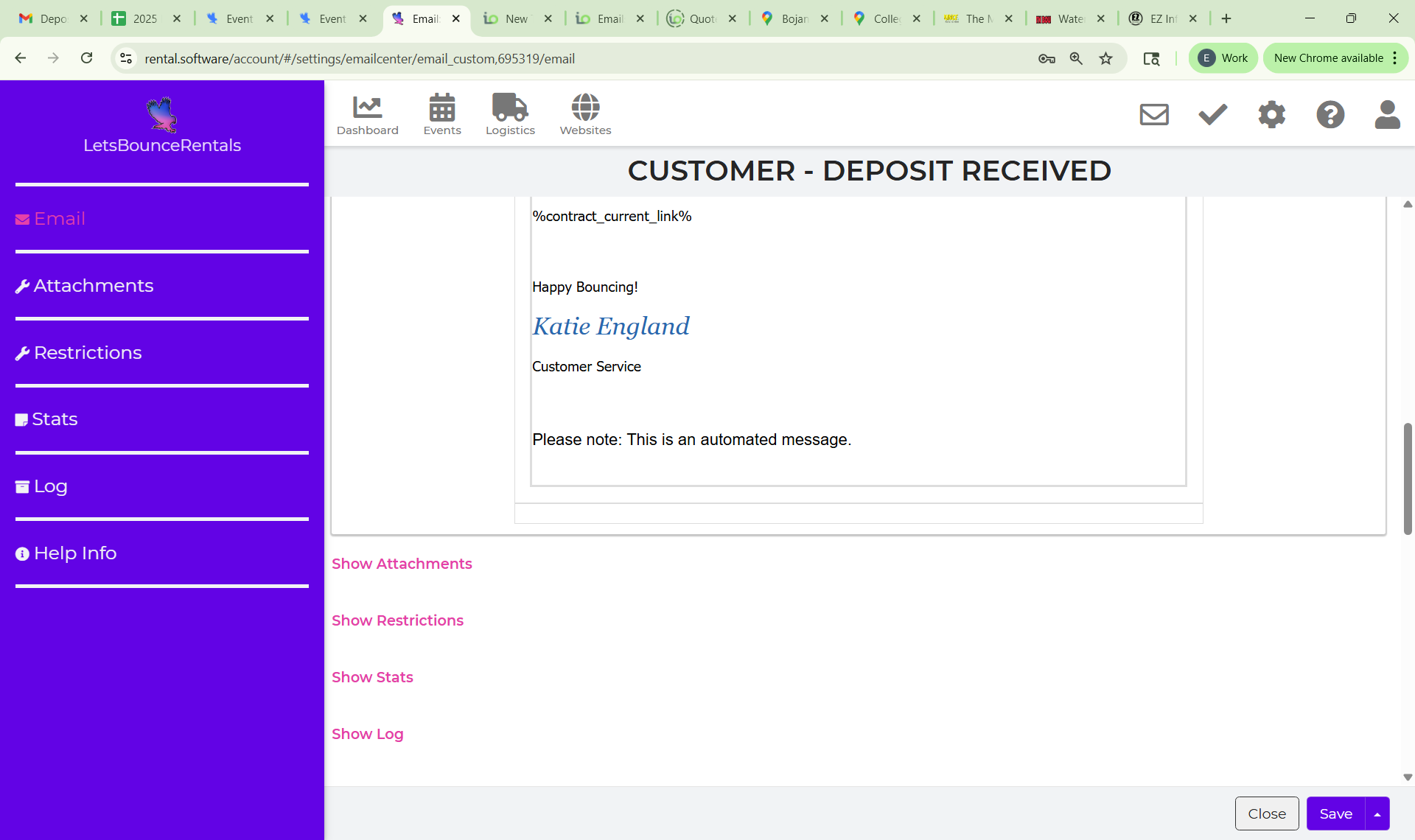 We just discovered that at the bottom of certain automatic emails (Deposit Received, specifically) that there is a blurb "This email was sent by Let's Bounce Rentals.... personal address". Obviously we'd like to remove that, however there is nothing in the email template to indicate that will show in the final email. I also checked automations and filters. It does not show when I manually send a "Deposit Received" email to a customer. I'm at a loss!