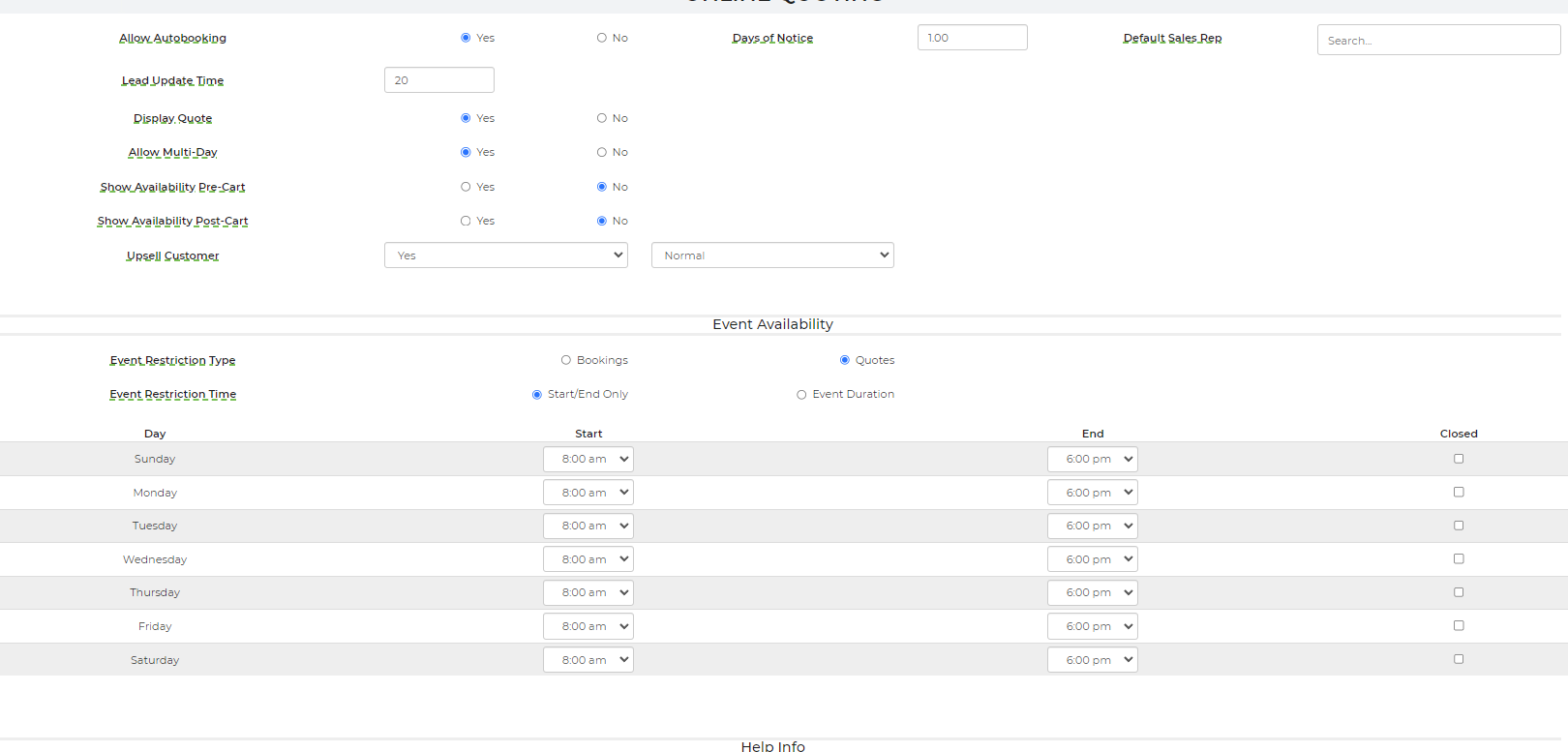 I have attached screen shots below. I do not want the customers to be able to book later than 6PM. I am trying to start using the automated event reminder emails but it does not go off the time slots the customer chooses. It goes off the 7:00-7:00 slot they chose during the quote.