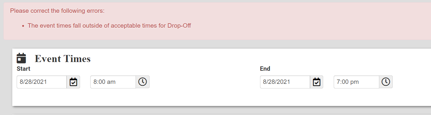 The bookings still show the error "The event times fallout of the acceptable times for drop-off." I have attached an image of my Event Availability within Online Quoting settings. I have also attached the error message when trying to book for a Saturday at 9am (should be available). What do I need to change?