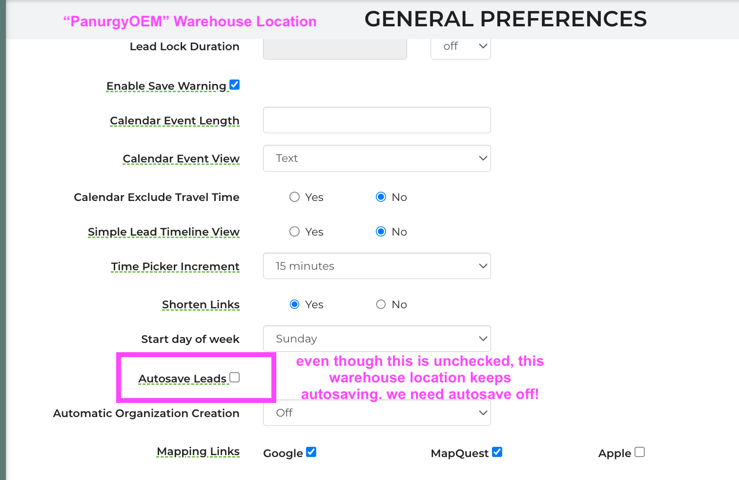 I turned on Autosave for our warehouse location called "LSS" because we were testing out Conditional Pricing. I was careful not to touch the settings in the other warehouse locations - and even though Autosave is NOT checked for our other warehouse locations, iO is in fact autosaving leads when working in thee other locations.