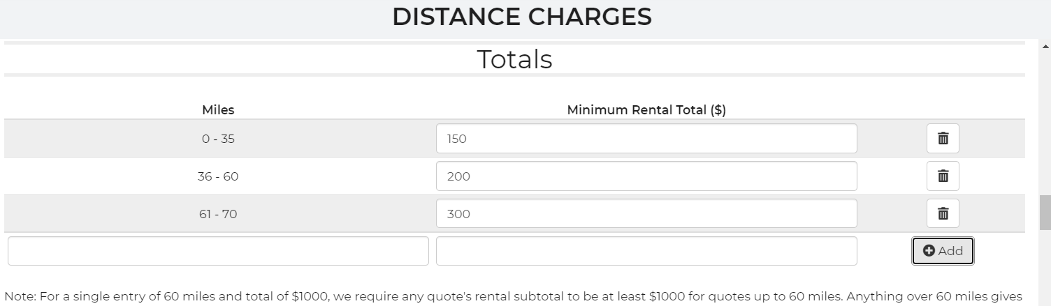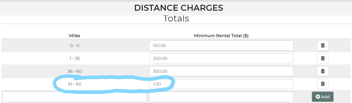 This can be managed in Settings-->Distance charges...under the "Totals" section this requires a minimum rental total. However I did notice on the one it is backwards and you have it as 61-60 for $1.00 (see attached) are you wanting 61+ miles? How far are you willing to go? Also noticed you have 0-0 as $150.00 and then 1-35 as $200. I'm going to attach an example of how it should look. When entering the "miles" for example on the line for 1-35 you only need to enter the ending mileage of "35" in as the miles and it will calculate the 1-35 automatically.