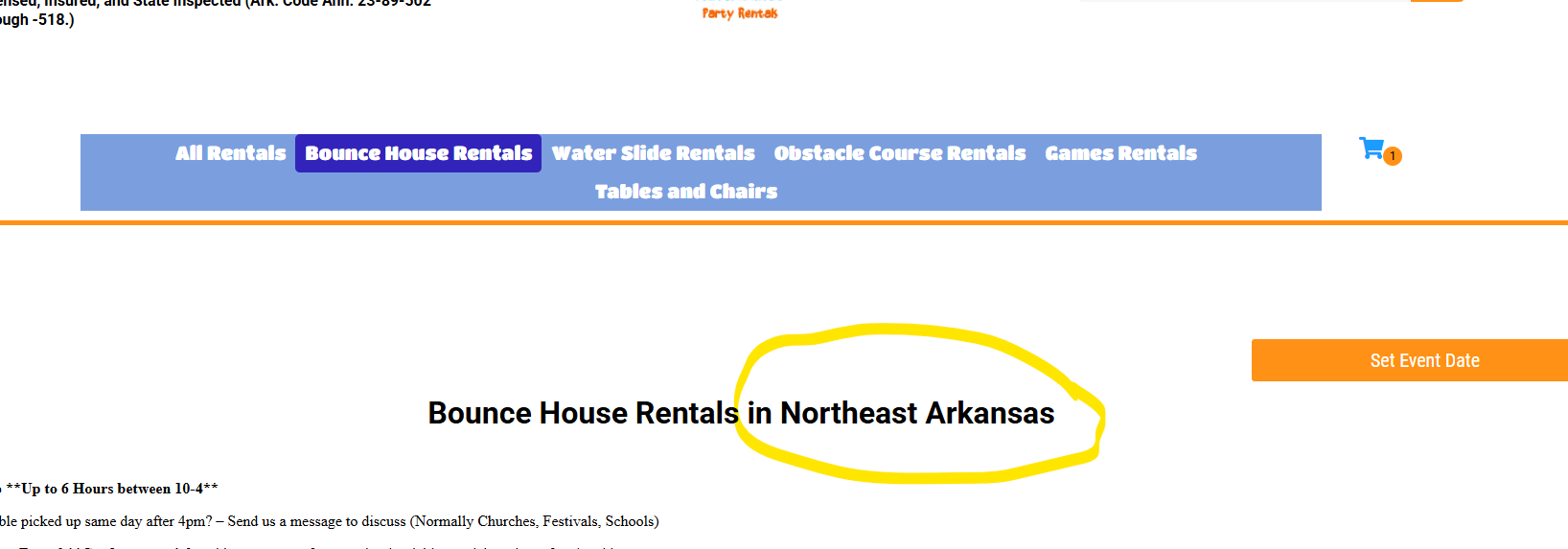 It's probably the shortcoder in wordpress. If you can edit code you can do it. Go to wordpress. then Inflatable office plug in. Then choose shortcoder option. At the bottom of the page you'll see a category button. click that. Now searwch for "in northeast Arkansas" and delete it. Save.