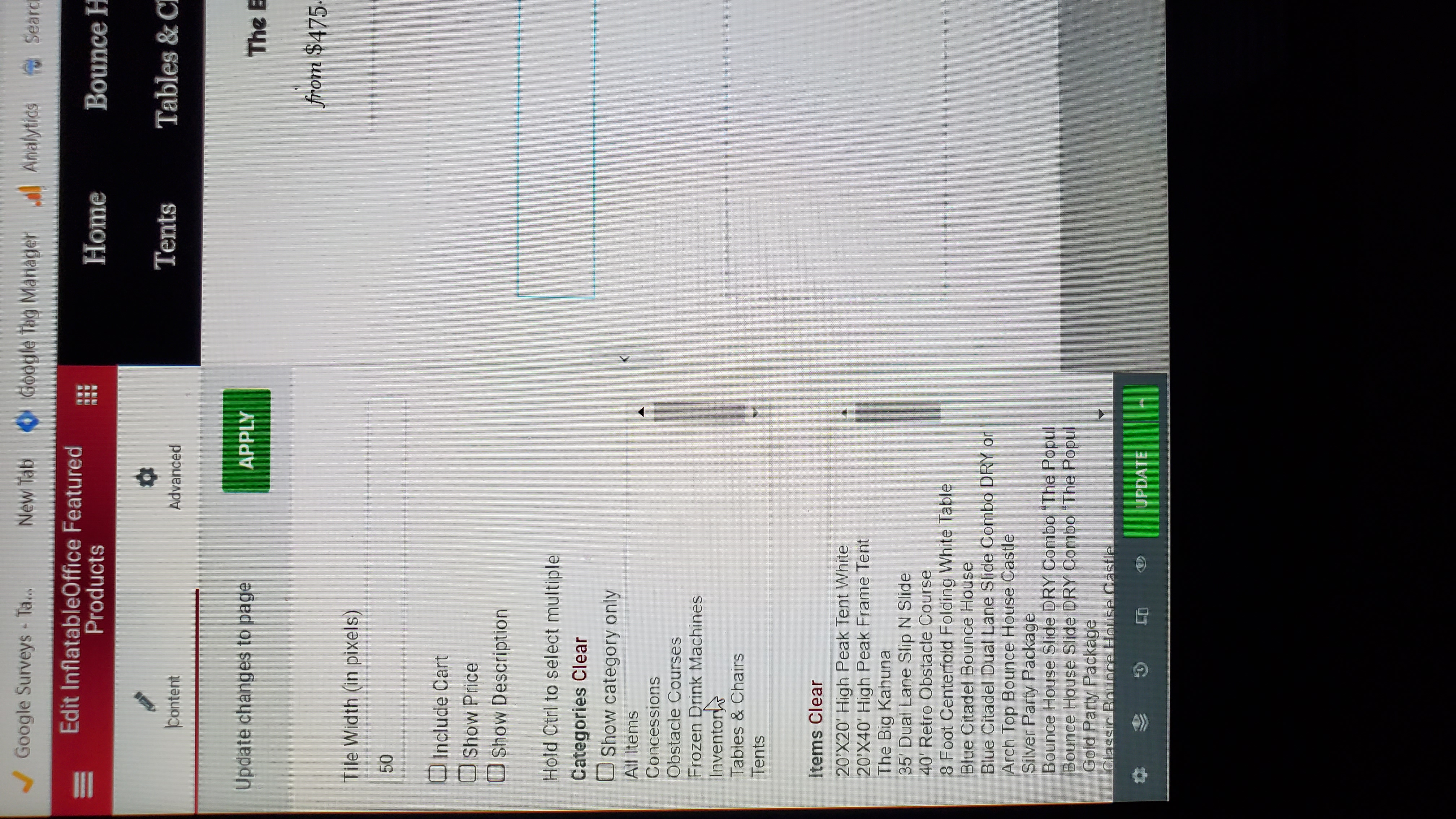 The yellow error message and when try to add featured products it doesn't show the new inventory I added this morning or even our water slide category