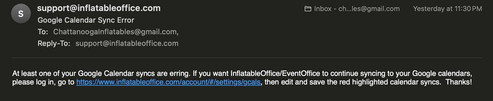 Today I received an email at 5:11PM that said, "At least one of your Google Calendar syncs are erring. If you want InflatableOffice/EventOffice to continue syncing to your Google calendars, please log in, go to https://www.inflatableoffice.com/account/#/settings/gcals, then edit and save the red highlighted calendar syncs. Thanks!"