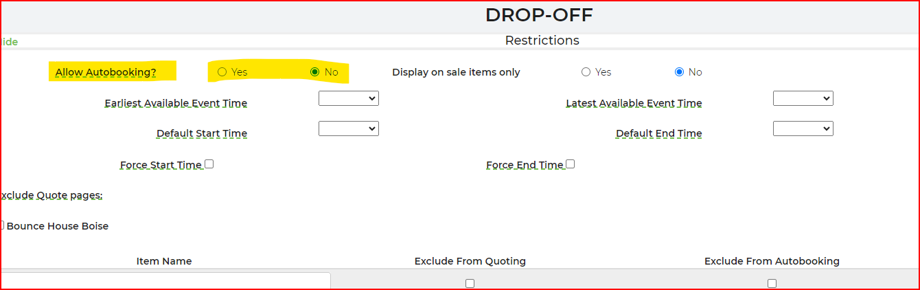 Good morning Evan, you have it set to not allow autobooking in your delivery method of Drop Off, if you want to change this you would go to your Settings-->Delivery Methods-->Restrictions and you can change that there (see screenshot)