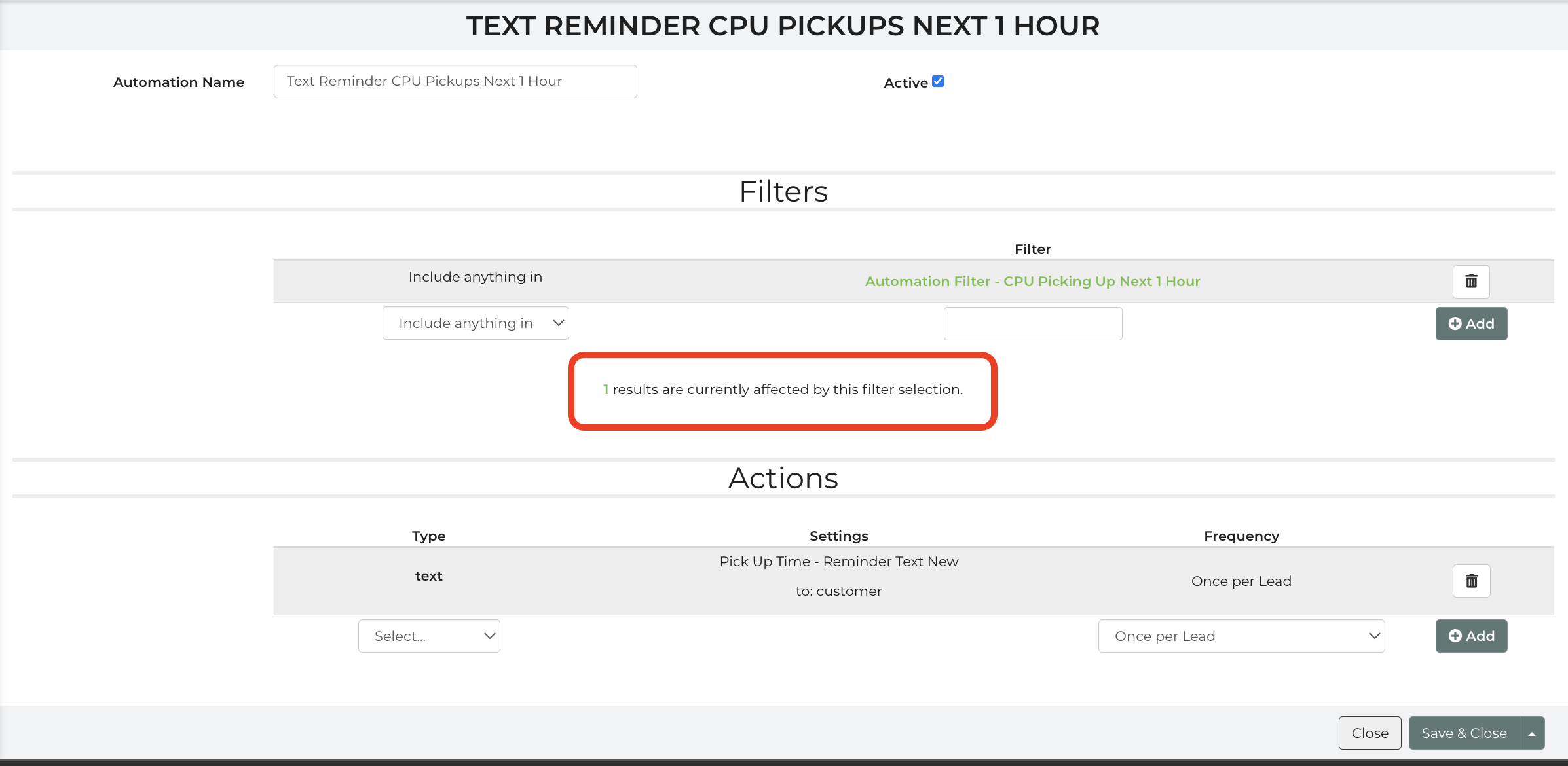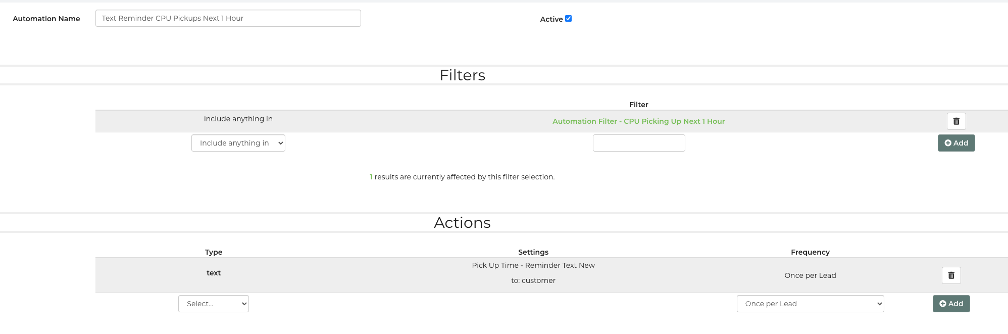 I saw that in the log so I enabled the text for my number and ran a test. Again, the automation showed "1 lead effected" but did not actually run. We also had customers this past weekend say they never received the texts