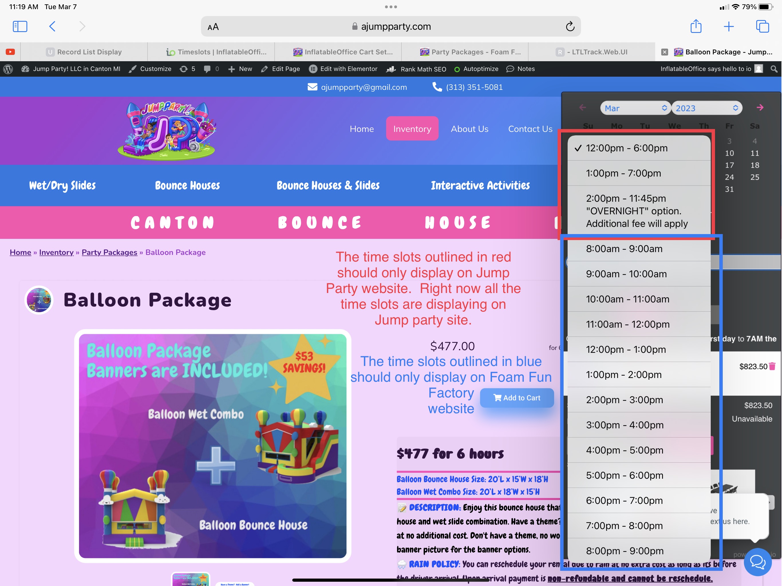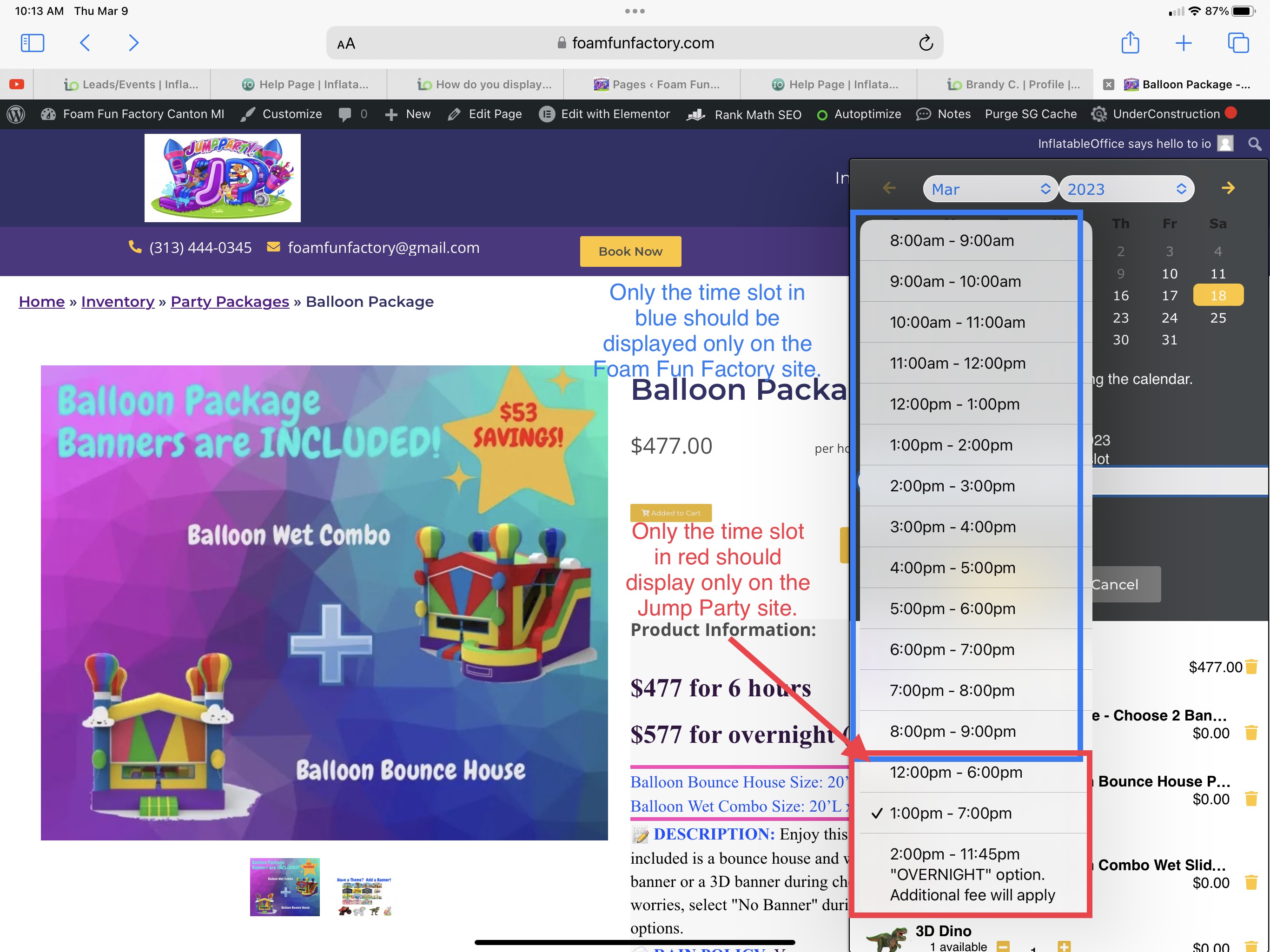 Time slots are not display correctly on both websites. The Jump party website is displaying all the time slots. The foam fun factory is displaying jump party time slots. See document attached. Thanks