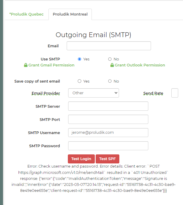 Hello Susan, I undated the employee ''email setting'' yesterday and he could send a few emails this morning and now, he can't. I checked his settings and all seams ok but when testing, this message is shown: