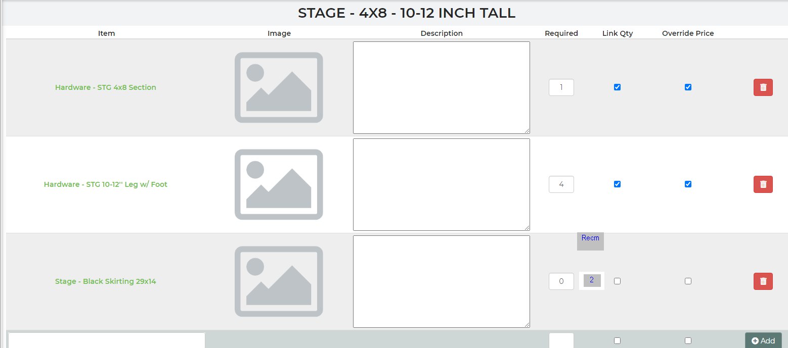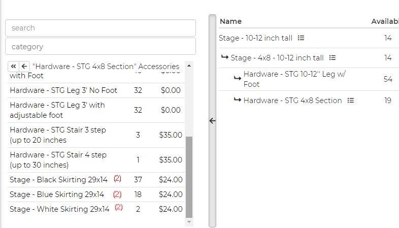 For my stages. We offer 3-5 inch tall, 9-11 inch tall, 18-22 inch tall, and 3 foot tall. The only way I can see showing the stages properly is by having a primary item for each height. Within the individual heights I can specify the number of legs needed. This works however I end up with 10 stages under each item name for height. if the accessory is not "Required" then when added there is only 1 accessory added. Thus, if my booking staff is not paying attention I am sending an 8x8 stage with 1 leg.