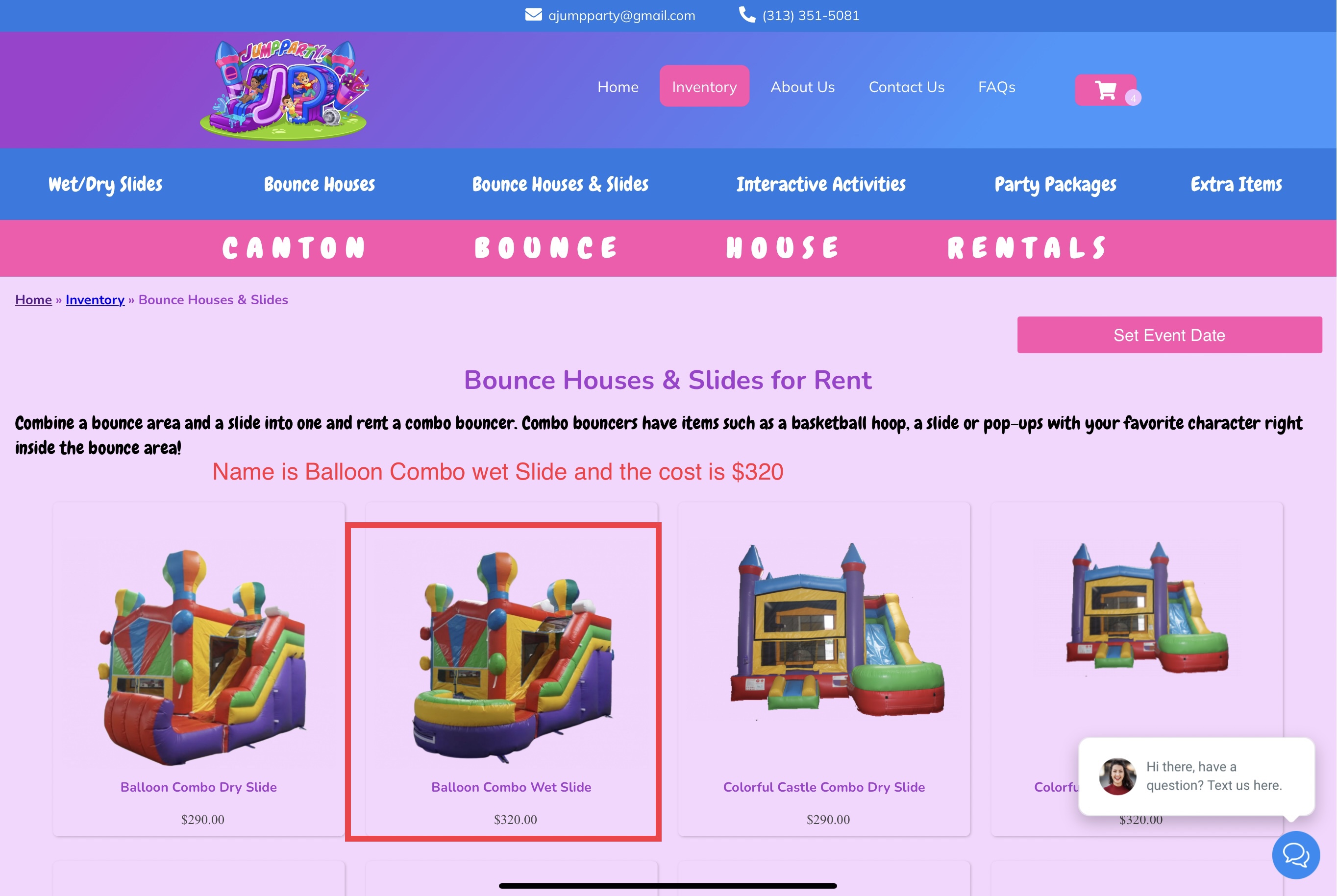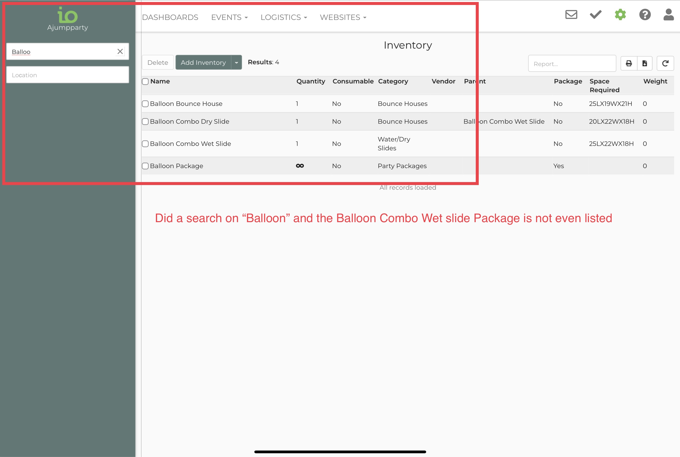 On the category page, the name is displayed as “Balloon Combo Wet Slide” with the price as $320. When I click on the item, the name changed to “Balloon Combo Wet Slide Package” and the price change to $300. When I log into IO, I do a search on all my balloon items and the Balloon Combo Wet Slide Package is not in the list. I’ve attached 3 screenshots: Please change that the same item that is displayed on the category page is the same item and price once you click on the item. Thanks